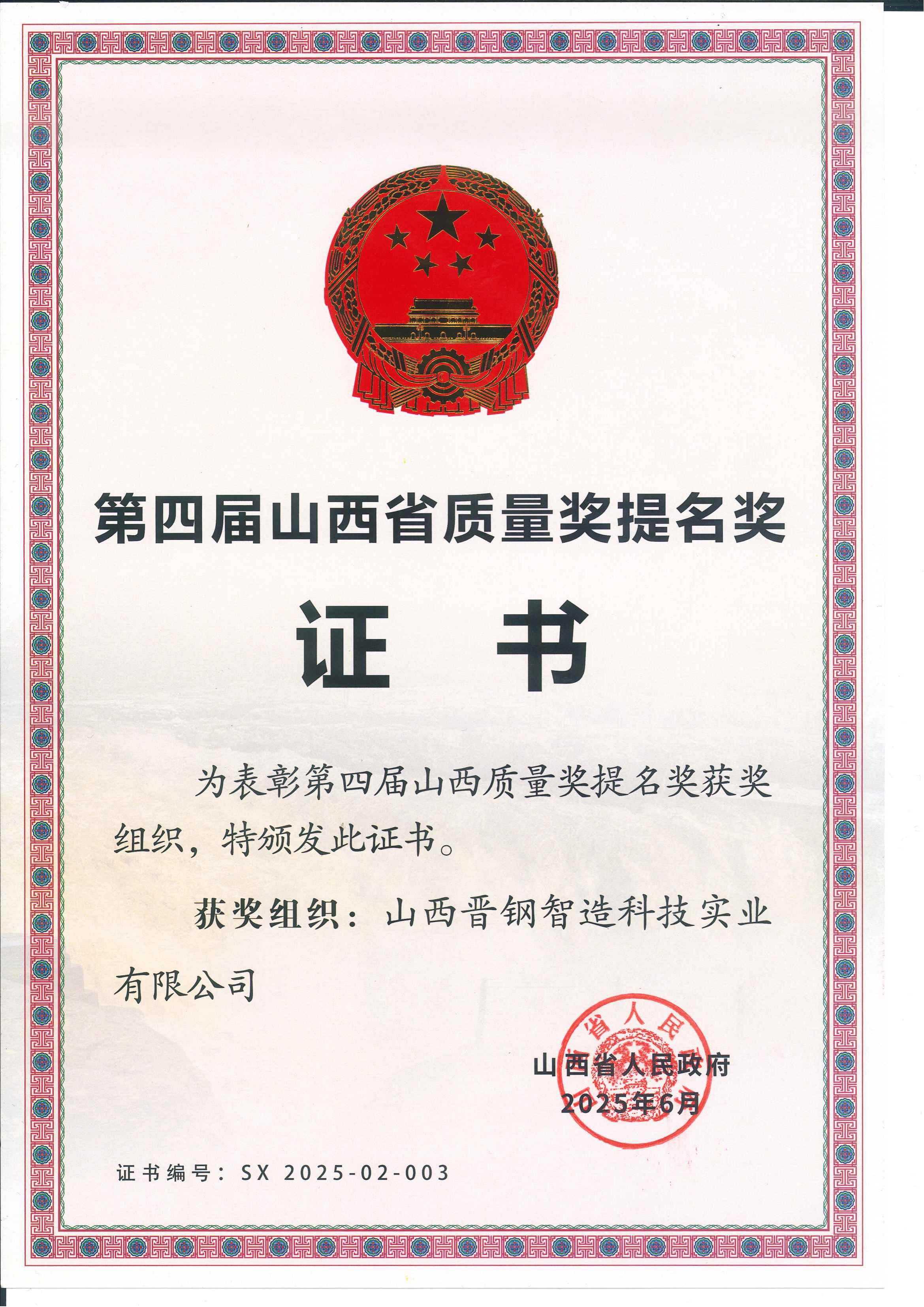 第四屆山西省質(zhì)量獎(jiǎng)提名獎(jiǎng)