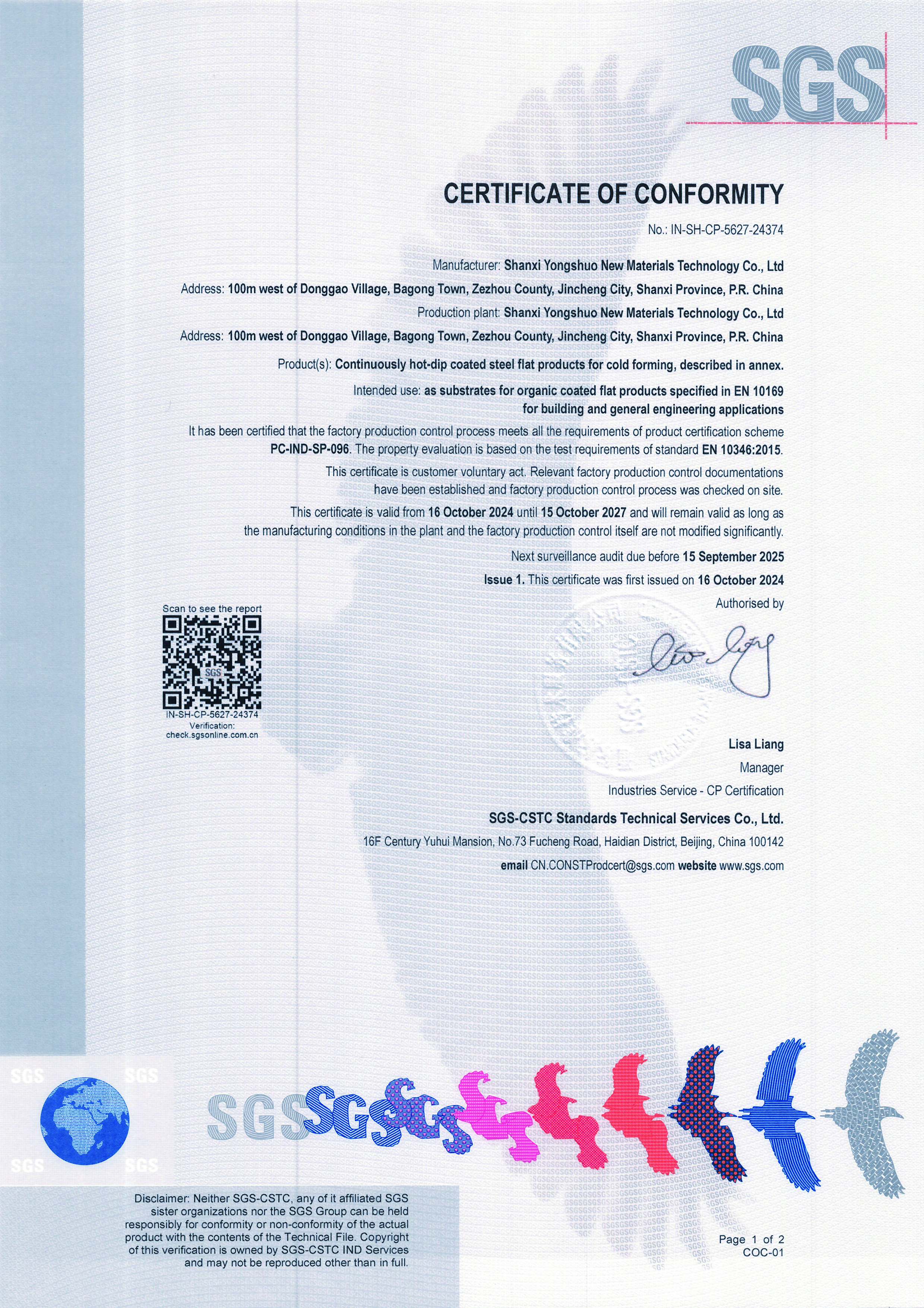 永碩EN 10346歐標(biāo)熱鍍標(biāo)準(zhǔn)SGS認(rèn)證(第一頁)