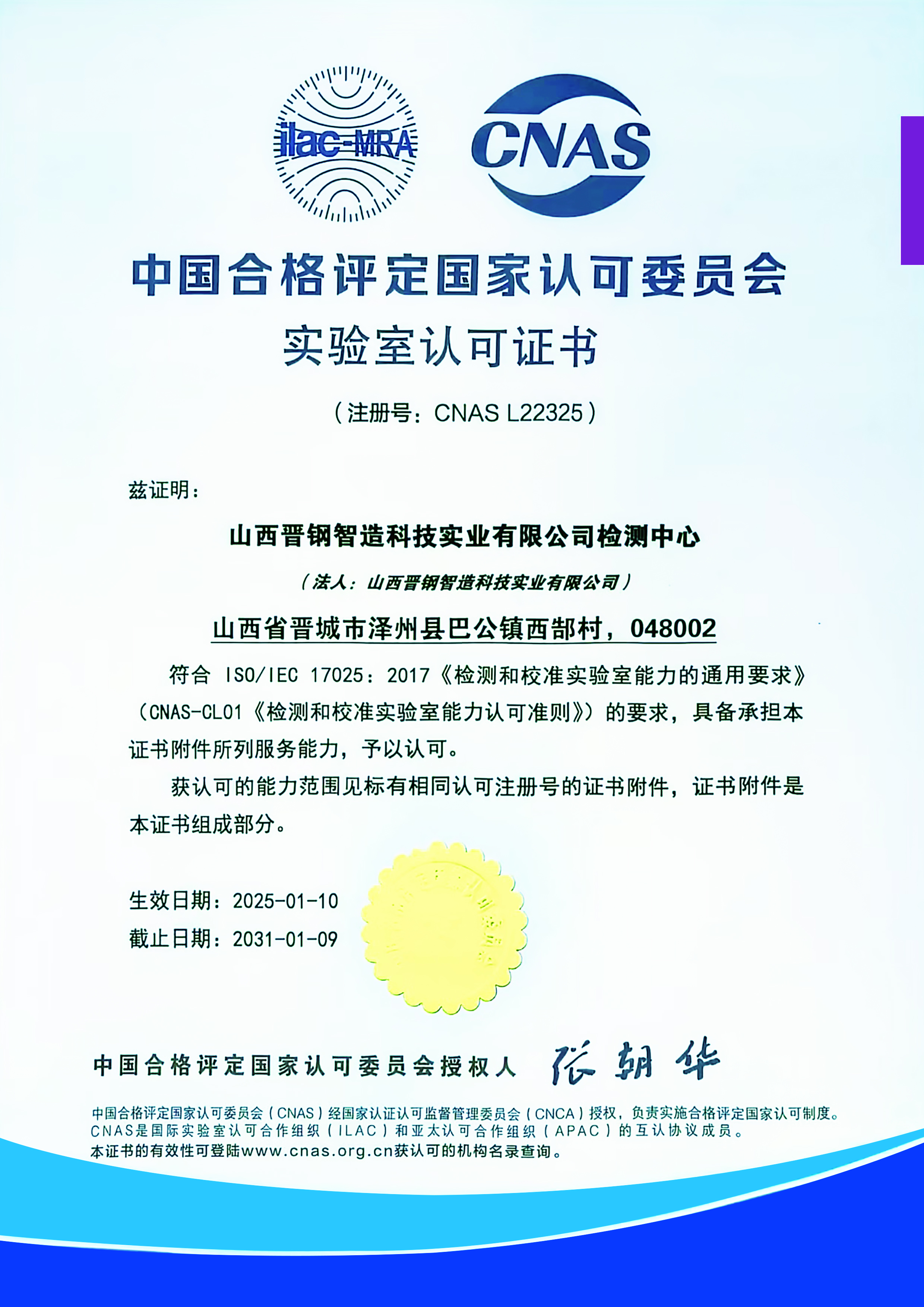 晉鋼智造科技實(shí)業(yè)有限公司檢測中心CNAS認(rèn)可證書