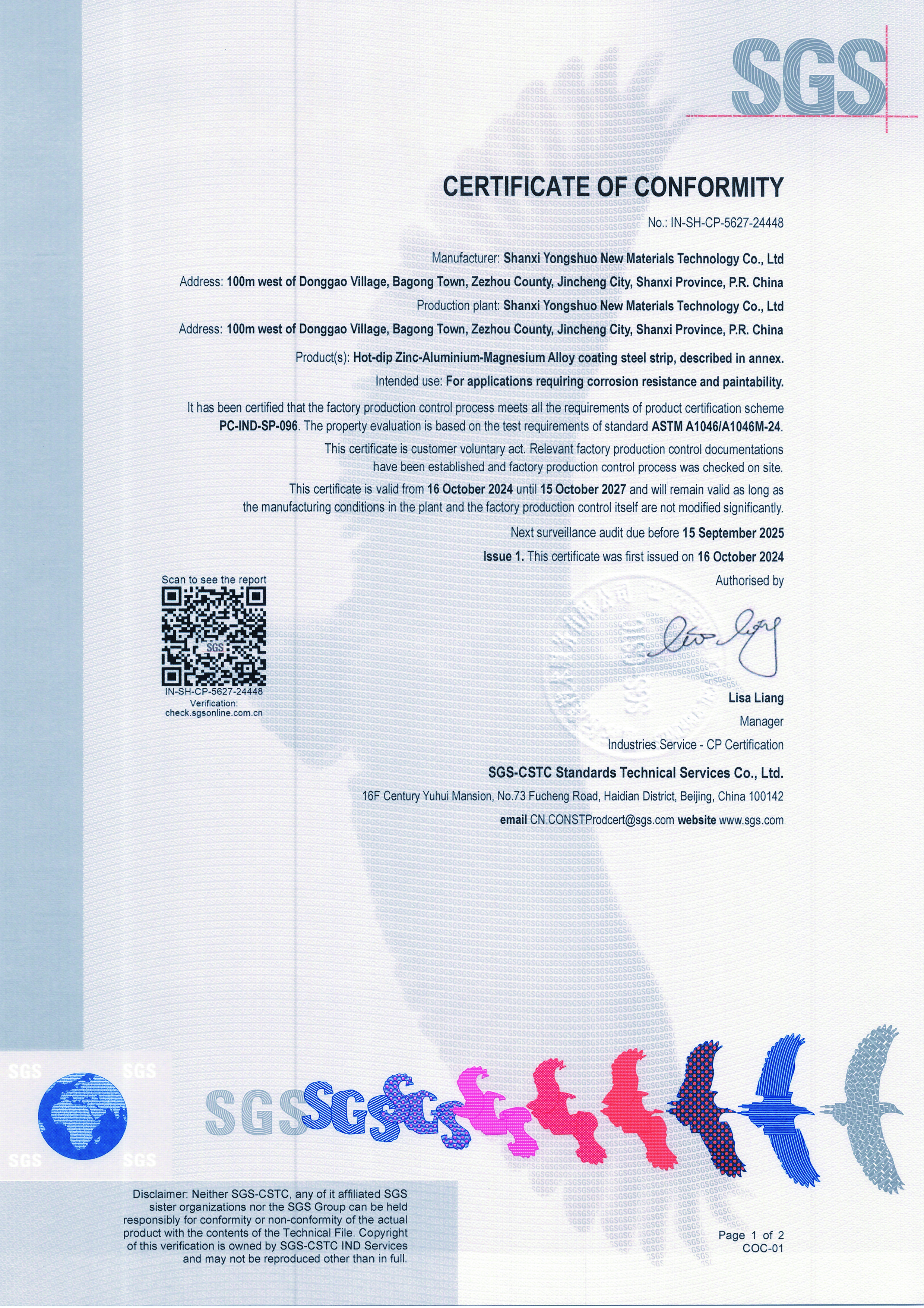 永碩ASTM 1046美標(biāo)熱鍍標(biāo)準(zhǔn)SGS認(rèn)證(第一頁)