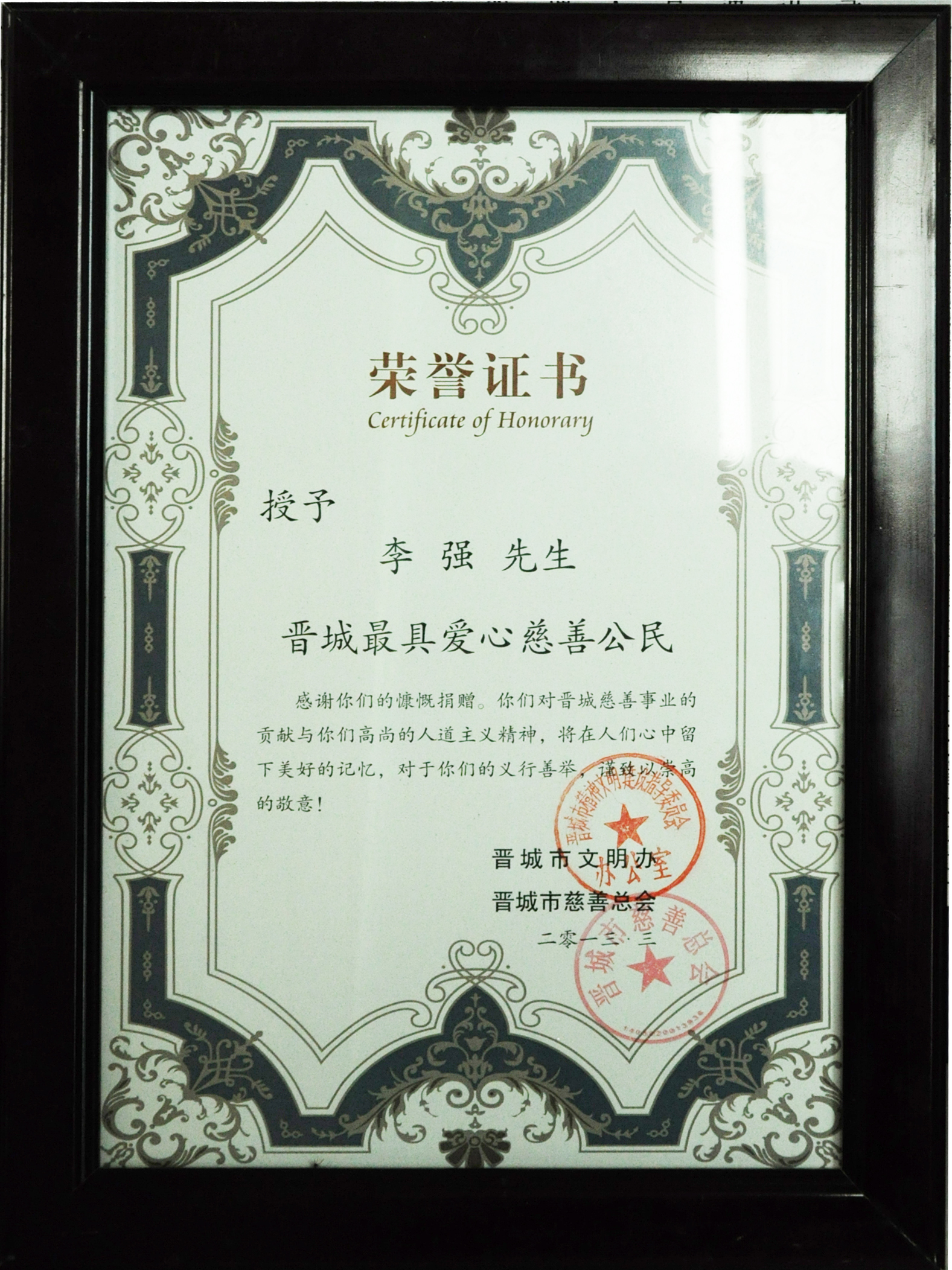 總裁李強(qiáng)獲“晉城最具愛心慈善公民”