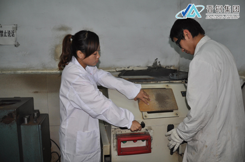 除做連鑄、轉(zhuǎn)爐、片樣檢測外,吳莎莎還會根據(jù)工作需要切割樣。切割樣通常由男化驗(yàn)員完成,同時班長要在現(xiàn)場監(jiān)督安全。圖為吳莎莎與男化驗(yàn)員在切割樣。